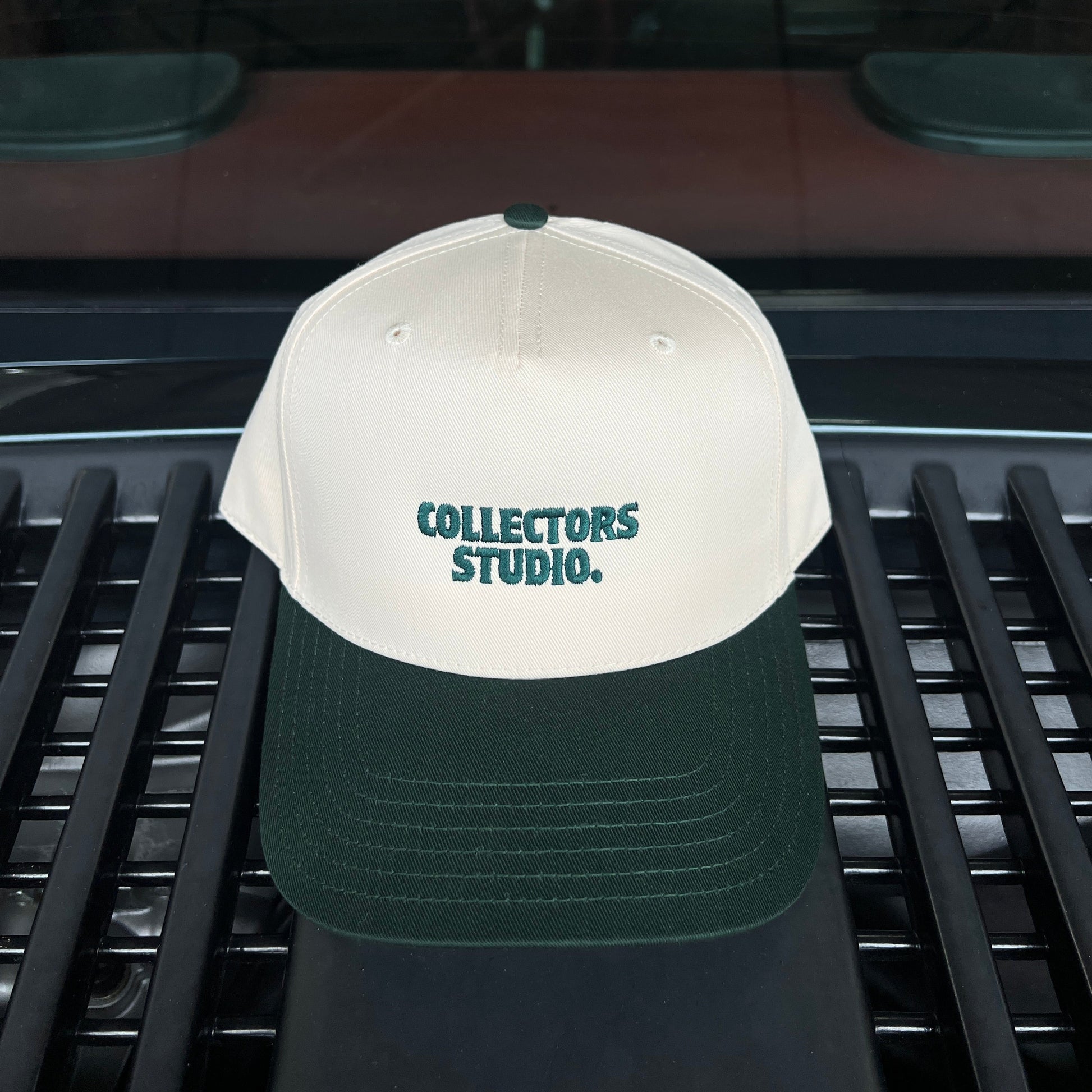 Two tone Cream and Forest Green 5 panel pro style cap.